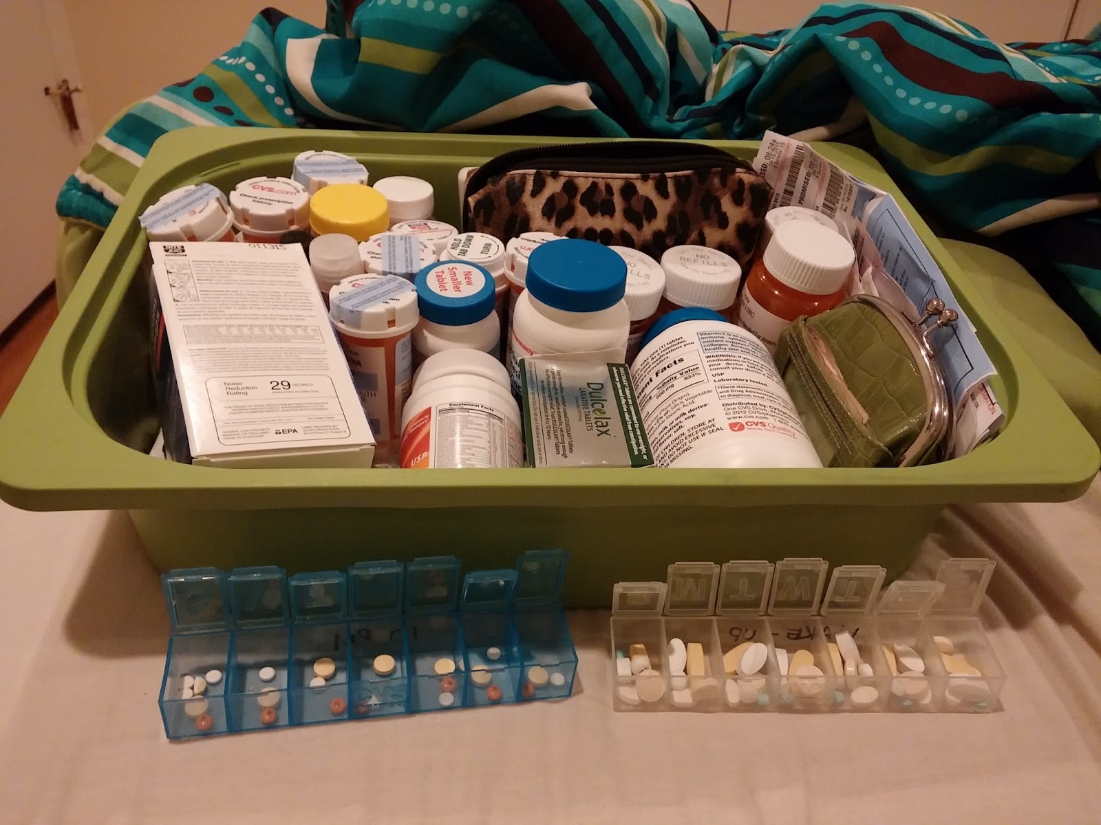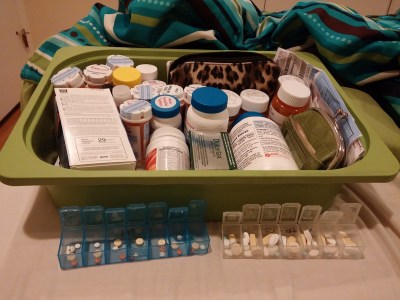 My medicine bin. Last night as I was refilling my pill containers I realized this is the part of Depression that most people do not see but proves that this disease is real. Countless medications.